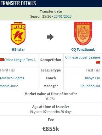 德转显示,湖北青年星门将姚浩洋加盟重庆铜梁龙的转会费约700万人民币。