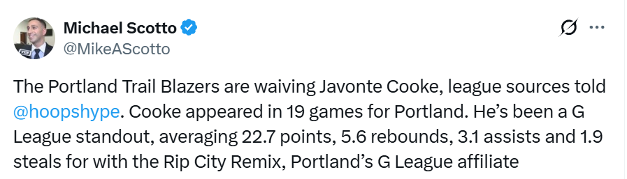 签下扬布拉德后,开拓者决定裁掉库克。库克为开拓者出战了19场比赛,他在G联赛表现十分出色,代表开拓者下属球队混音队场均得到22.7分、5.6篮板、3.1助攻、1.9抢断。目前,开拓者拥有2名双向合同球员(扬布拉德和乐福)与15名标准合同球员,球队18人大名单还未满员。